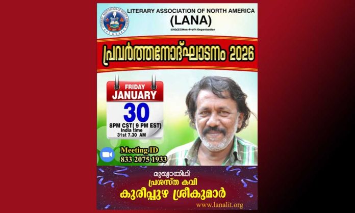 HomeAmericaലാനയുടെ 2026 വർഷത്തെ പ്രവർത്തന ഉദ്ഘാടനം പ്രശസ്ത കവി കുരീപ്പുഴ ശ്രീകുമാർ നിര്‍വഹിക്കും
