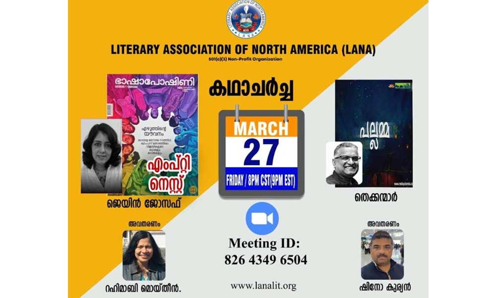ലിറ്ററിറി അസോസിയേഷൻ ഓഫ് നോർത്ത് അമേരിക്ക (LANA) യുടെ പ്രതിമാസ സാഹിത്യ ചർച്ച മാർച്ച് 27 വൈകിട്ട് 8 മണിക്ക് (CST)സൂം വഴി നടത്തുന്നതാണ്.