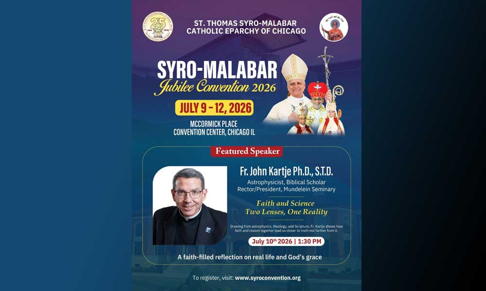 2026 ജൂലൈ 9 മുതൽ 12 വരെ ചിക്കാഗോയിലെ മക്കോർമിക് പ്ലേസ് കൺവെൻഷൻ സെന്ററിൽ നടക്കുന്ന ഈ മഹാസമ്മേളനത്തിലേക്ക് എല്ലാവരെയും ആത്മാർത്ഥമായി ക്ഷണിക്കുന്നതായി രൂപതാധ്യക്ഷൻ മാർ ജോയ് ആലപ്പാട്ട് അറിയിച്ചു. ആത്മീയ ചിന്തകളും കുടുംബസൗഹൃദ പരിപാടികളും വിശ്വാസത്തിന്റെ സാംസ്കാരിക സമൃദ്ധിയും ഒരുമിക്കുന്ന ഈ ജൂബിലി വേദിയിൽ കുടുംബങ്ങളോടൊപ്പം പങ്കെടുക്കാൻ അദ്ദേഹം വിശ്വാസികളെ ആഹ്വാനം ചെയ്തു. ജീവിതയാത്രയിൽ വിശ്വാസവും അറിവും കൈകോർക്കുന്ന അനുഭവമായി ഈ കൺവെൻഷൻ മാറുമെന്ന പ്രതീക്ഷയോടെ, നേരത്തെ തന്നെ രജിസ്റ്റർ ചെയ്ത് ഈ അനുഗ്രഹീത സംഗമത്തിന്റെ ഭാഗമാകണമെന്ന് സംഘാടകർ അഭ്യർത്ഥിക്കുന്നു. കൂടുതൽ വിവരങ്ങൾക്കും രജിസ്ട്രേഷനും www.syroconvention.org