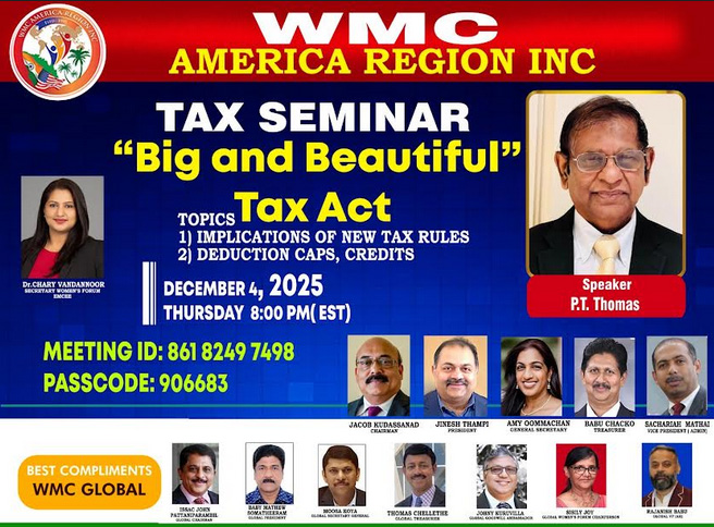 “ബിഗ് ആൻഡ് ബ്യൂട്ടിഫുൾ ടാക്സ് ആക്ട് ” എന്ന വിഷയത്തിൽ ട്രംപ് സർക്കാരിന്റെ പുതിയ ടാക്സ് നിയമങ്ങൾ, വിവിധ ഡിഡക്ഷൻ ഓപ്ഷൻസ്, ക്രെഡിറ്റ് മുതലായവയാണ് പ്രധാനമായും സെമിനാറിൽ ചർച്ചാ വിഷയമായത്