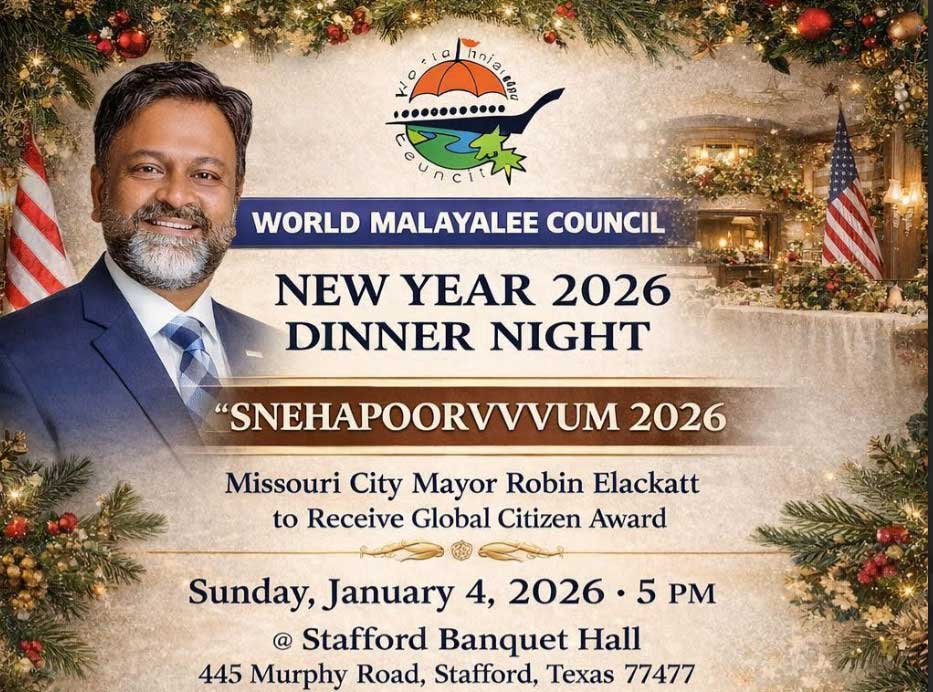 ഹൂസ്റ്റൺ, ടെക്സാസ്:വേൾഡ് മലയാളി കൗൺസിൽ (WMC) “സ്നേഹപൂർവ്വം 2026” എന്ന പേരിൽ പുതുവത്സര 2026 ഡിന്നർ നൈറ്റ് 2026 ജനുവരി 4-ന് (ഞായർ) വൈകിട്ട് 5:00 മണിക്ക് ടെക്സാസിലെ സ്റ്റാഫോർഡിലുള്ള സ്റ്റാഫോർഡ് ബാങ്ക്വറ്റ് ഹാളിൽ സംഘടിപ്പിക്കുന്നു.
