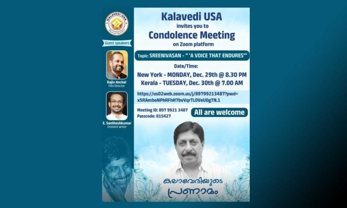 ന്യൂയോർക്ക്: പ്രശസ്ത നടനും തിരക്കഥാകൃത്തുമായ ശ്രീനിവാസന് ആദരവർപ്പിച്ചുകൊണ്ട് കലാവേദി യുഎസ്എ അനുസ്മരണ യോഗം സംഘടിപ്പിക്കുന്നു. ‘ശ്രീനിവാസൻ – എ വോയ്സ് ദാറ്റ് എൻഡ്യുയേഴ്സ്’ (A Voice That Endures) എന്ന വിഷയത്തിലാണ് ഓൺലൈൻ സംഗമം നടക്കുന്നത്.