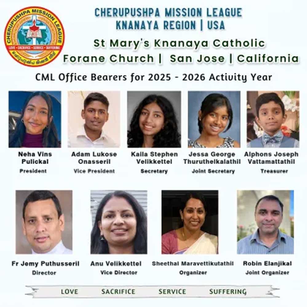 സാൻഹൊസെ, കാലിഫോർണിയ: അമേരിക്കയിലെ സാൻ ഹൊസെയിൽ സ്ഥിതി ചെയ്യുന്ന സെന്റ് മേരീസ് ക്നാനായ കാത്തലിക് ഫൊറോന ചർച്ചിലെ CML യൂണിറ്റിന് പുതു നേതൃത്വം. നവംബർ 9 ന് ആയിരുന്നു പുതു നേതൃത്വം സ്ഥാനം ഏറ്റത്.