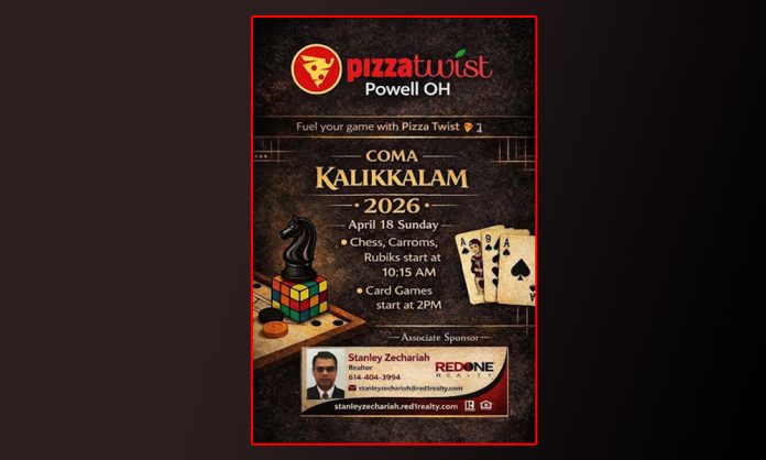 കൊളംബസ്, ഒഹായോ: കൊളംബസ് പ്രദേശത്തെ മലയാളി സമൂഹത്തെ ഒരുമിപ്പിക്കുന്ന പരിപാടിയായ കോമ (COMA) കളിക്കളം 2026 ഗെയിം നൈറ്റ് ഏപ്രിൽ 18 ശനിയാഴ്ച നടക്കും. നൂറിലതികം പേർ പങ്കെടുക്കുമെന്ന് പ്രതീക്ഷിക്കുന്ന ഈ പരിപാടി കുടുംബങ്ങൾക്കും കുട്ടികൾക്കും ഒരുപോലെ ആവേശകരമായ ഒരു സംഗമമാകുമെന്ന് സംഘാടകർ അറിയിച്ചു.