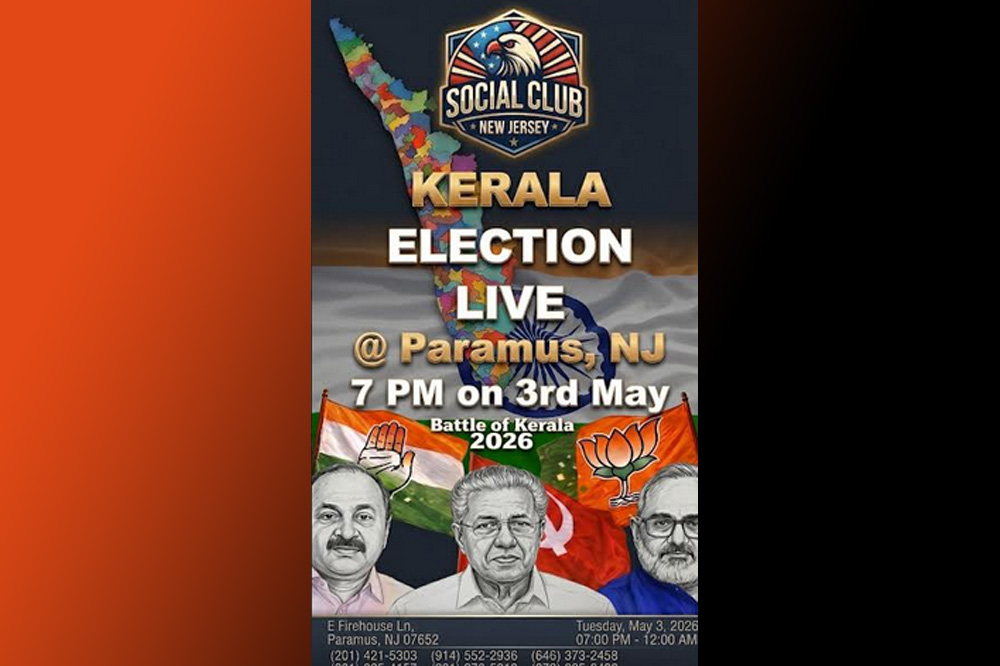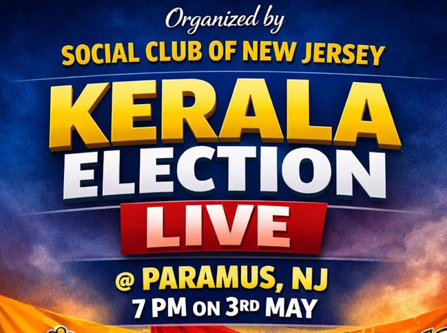 ന്യൂ ജേഴ്സി സോഷ്യൽ ക്ലബിന്റെ ആഭിമുഖ്യത്തിൽ കേരളാ ഇലക്ഷൻ റിസൾട്ട് വാച്ച് നൈറ്റ് ലൈവ് മെയ് 3 ന് വൈകുന്നേരം 7 മണിക്ക്. കേരളത്തിൽ അരങ്ങേറുന്ന നിയമസഭാ തിരഞ്ഞെടുപ്പിന്റെ ഫലങ്ങൾ നേരിട്ട് കാണുന്നതിനാണ് ന്യൂ ജേഴ്സി സോഷ്യൽ ക്ലബ് അവസരമൊരുക്കുന്നത്