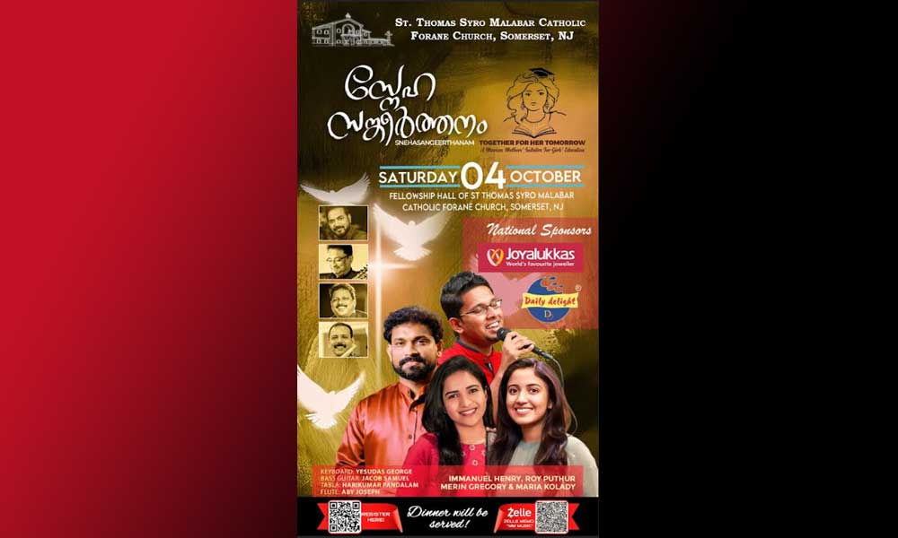 സോമർസെറ്റ്, ന്യൂജേഴ്സി: കേരളത്തിലെ നിർധനരായ പെൺകുട്ടികളുടെ വിദ്യാഭ്യാസത്തിന് കൈത്താങ്ങാകുന്ന ‘Together for Her Tomorrow’ എന്ന മഹനീയ പദ്ധതിയുടെ ധനസമാഹരണാർത്ഥം, ‘സ്നേഹസങ്കീർത്തനം 2025’ എന്ന പേരിൽ ഒരുക്കുന്ന ബൃഹത്തായ ആത്മീയ സംഗീത വിരുന്ന് ഈ വരുന്ന ഒക്ടോബർ 4, ശനിയാഴ്ച ന്യൂജേഴ്സിയിലെ സോമർസെറ്റിലുള്ള സെൻ്റ് തോമസ് സീറോ മലബാർ ഫൊറോന ദേവാലയത്തിൽ അരങ്ങേറും. മരിയൻ മദേഴ്‌സ് സംഘടനയും, സെൻ്റ് വിൻസെൻ്റ് ഡി പോൾ സൊസൈറ്റിയും സംയുക്തമായാണ് ഈ പരിപാടി സംഘടിപ്പിക്കുന്നത്.