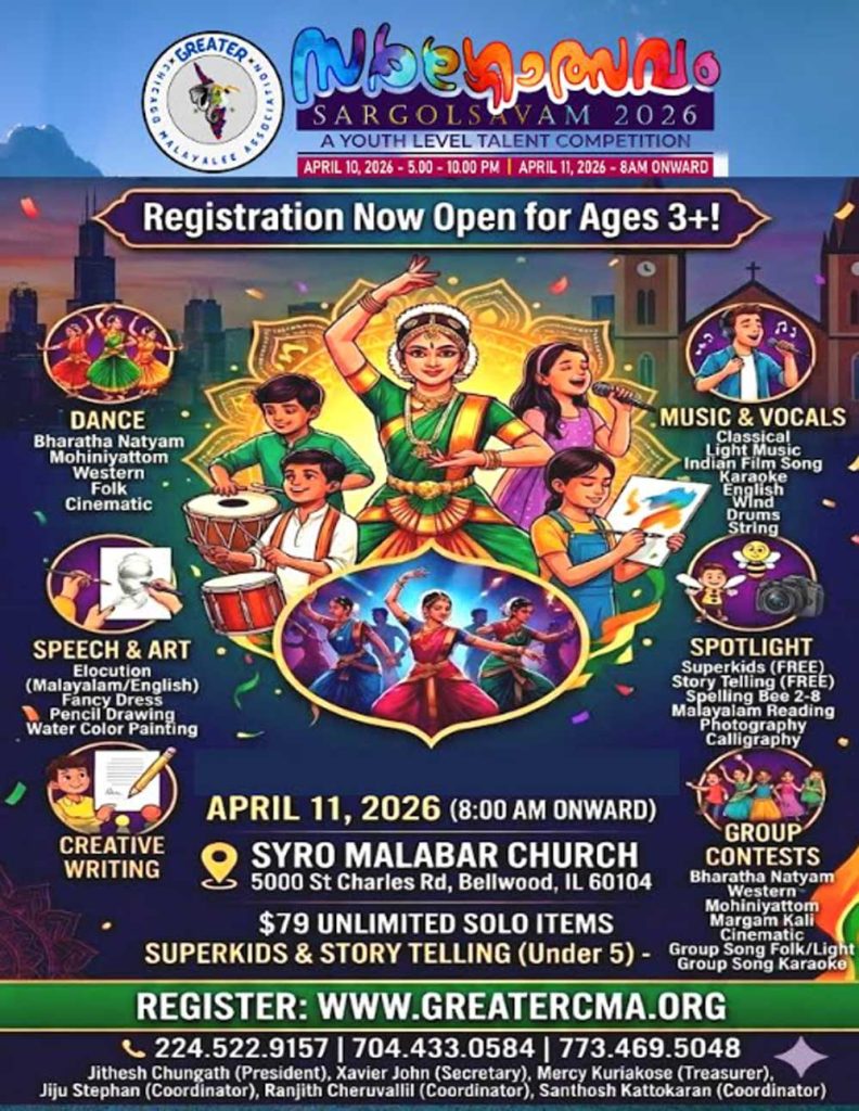 ഗ്രേറ്റർ ഷിക്കാഗോ മലയാളി അസോസിയേഷൻ (GCMA) സംഘടിപ്പിക്കുന്ന വിപുലമായ യുവജനോത്സവം ‘സർഗോത്സവം 2026’ ഏപ്രിൽ 11-ന് നടക്കും. 3 വയസ്സു മുതൽ 18 വയസ്സു വരെയുള്ള കുട്ടികൾക്കായി വിവിധ വിഭാഗങ്ങളിലായാണ് മത്സരങ്ങൾ ക്രമീകരിച്ചിരിക്കുന്നത്. ഷിക്കാഗോയിലെയും പരിസരപ്രദേശങ്ങളിലെയും പ്രതിഭകളായ കുട്ടികൾക്കും യുവാക്കൾക്കും തങ്ങളുടെ കലാവൈഭവം പ്രകടിപ്പിക്കാനുള്ള മികച്ച വേദിയായി സർഗോത്സവം മാറും.