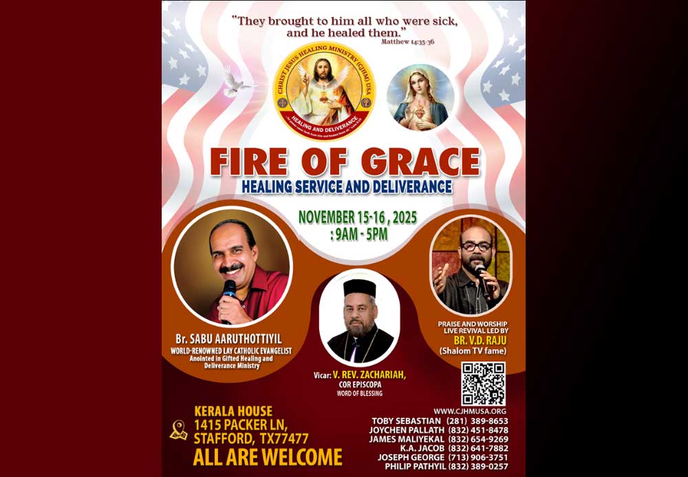 സ്റ്റാഫോർഡ് (ടെക്സസ്): ക്രൈസ്റ്റ് ജീസസ് ഹീലിംഗ് മിനിസ്ട്രി (CJHM) യുഎസ്എയുടെ ആഭിമുഖ്യത്തിൽ നടത്തുന്ന “ഫയർ ഓഫ് ഗ്രേസ്” രോഗശാന്തിയും വിടുതൽ ശുശ്രൂഷയും 2025 നവംബർ 15, 16 തീയതികളിൽ നടക്കും. സ്റ്റാഫോർഡിലെ കേരള ഹൗസാണ് ( 1415 Packer Ln, Stafford, TX 77477) വേദിയാകുന്നത്.