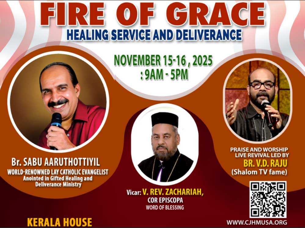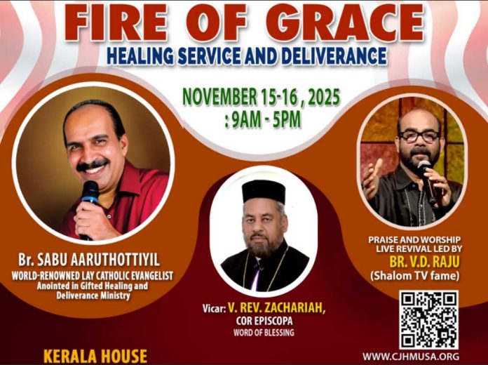 സ്റ്റാഫോർഡ് (ടെക്സസ്): ക്രൈസ്റ്റ് ജീസസ് ഹീലിംഗ് മിനിസ്ട്രി (CJHM) യുഎസ്എയുടെ ആഭിമുഖ്യത്തിൽ നടത്തുന്ന “ഫയർ ഓഫ് ഗ്രേസ്” രോഗശാന്തിയും വിടുതൽ ശുശ്രൂഷയും 2025 നവംബർ 15, 16 തീയതികളിൽ നടക്കും. സ്റ്റാഫോർഡിലെ കേരള ഹൗസാണ് ( 1415 Packer Ln, Stafford, TX 77477) വേദിയാകുന്നത്.