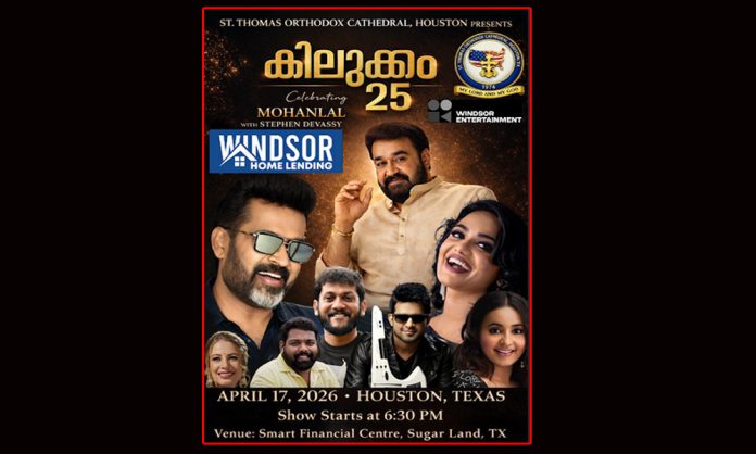 ഹൂസ്റ്റൺ: ഇന്ത്യൻ സിനിമയുടെ ഇതിഹാസ നടൻ മോഹൻലാലിനെ ആദരിച്ച് സംഘടിപ്പിക്കുന്ന “കിലുക്കം 25 : മോഹൻലാൽ ലൈവ് സ്റ്റേജ് ഷോ” 2026 ഏപ്രിൽ 17-ന് ടെക്സസിലെ ഷുഗർലാൻഡിലുള്ള സ്മാർട്ട് ഫിനാൻഷ്യൽ സെന്ററിൽ വച്ച് നടക്കുമെന്ന് സംഘാടകർ അറിയിച്ചു. ഹൂസ്റ്റൺ സെന്റ് തോമസ് ഓർത്തഡോക്സ് കത്തീഡ്രലിന്റെ നേതൃത്വത്തിൽ സംഘടിപ്പിക്കുന്ന ഈ പ്രീമിയം ലൈവ് സ്റ്റേജ് ഷോ, അമേരിക്കയിലുടനീളമുള്ള ആയിരക്കണക്കിന് ആരാധകരെ ഒരുമിച്ചു കൊണ്ടുവരുന്ന വൻ സാംസ്കാരിക ഉത്സവമായിരിക്കും.