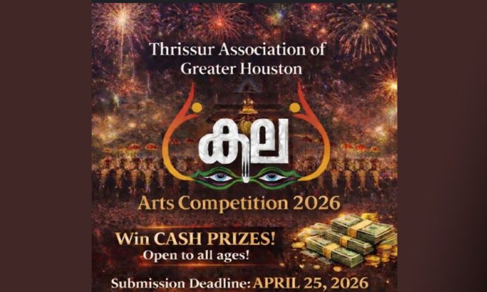 ഹൂസ്റ്റൺ: തൃശൂർ അസോസിയേഷൻ ഓഫ് ഗ്രേറ്റർ ഹൂസ്റ്റണിന്റെ ആഭിമുഖ്യത്തിൽ ‘കല 2026’ എന്ന പേരിൽ വിപുലമായ കലാമത്സരങ്ങൾ സംഘടിപ്പിക്കുന്നു. “തൃശൂർ – കേരളത്തിന്റെ സാംസ്കാരിക തലസ്ഥാനം” എന്ന പ്രമേയത്തെ ആസ്പദമാക്കിയാണ് മത്സരങ്ങൾ നടക്കുന്നത്. എല്ലാ പ്രായക്കാർക്കും പങ്കെടുക്കാവുന്ന ഈ മത്സരത്തിൽ ആകർഷകമായ പണക്കിഴികളാണ് വിജയികളെ കാത്തിരിക്കുന്നത്.
