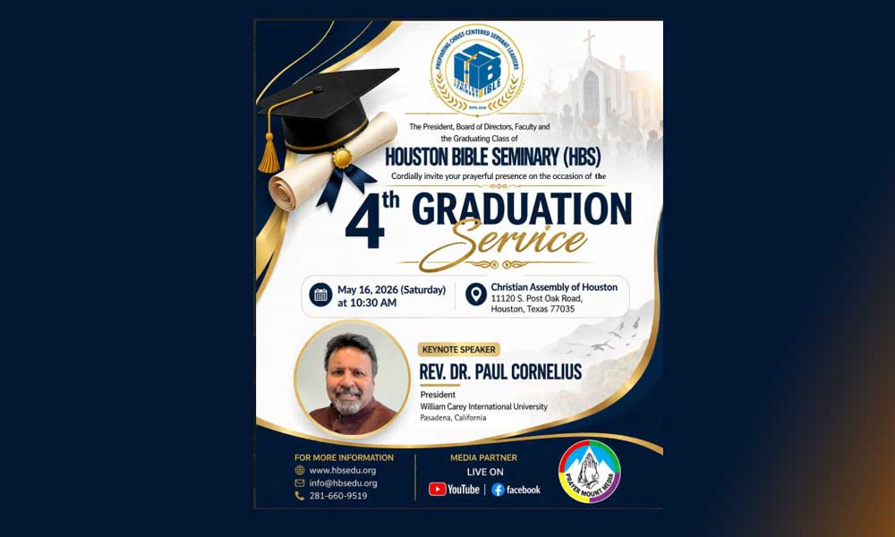 ഹൂസ്റ്റൺ: ഹൂസ്റ്റൺ ബൈബിൾ സെമിനാരി (HBS)യുടെ 4-ാമത് ഗ്രാജുവേഷൻ സർവീസ് മേയ് 16 ശനിയാഴ്ച രാവിലെ 10.30ന് ഹൂസ്റ്റണിലെ ക്രിസ്ത്യൻ അസംബ്ലി ഓഫ് ഹൂസ്റ്റൺ ചർച്ചിൽ (11120 S. Post Oak Road) നടക്കും.