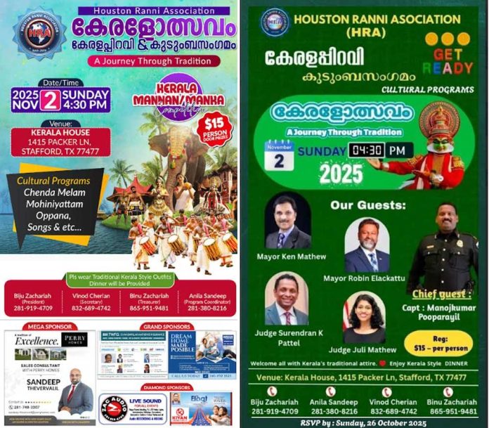 ഹൂസ്റ്റൺ: അമേരിക്കയിലെ പ്രമുഖ മലയാളി കൂട്ടായ്മകളിലൊന്നായ ഹൂസ്റ്റൺ റാന്നി അസോസിയേഷൻ (HRA) കേരളപ്പിറവി ആഘോഷവും കുടുംബസംഗമവും ‘കേരളോത്സവം – A Journey Through Tradition എന്ന പേരിൽ വൈവിധ്യമാർന്ന പരിപാടികളോടെ സംഘടിപ്പിക്കുന്നു.