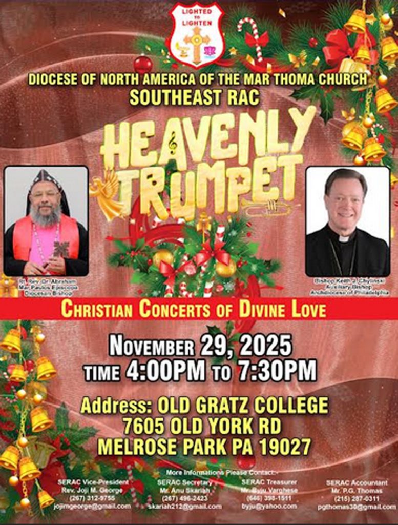 ഫിലഡൽഫിയ – മാർത്തോമാ സഭയുടെ നോർത്ത് അമേരിക്കൻ ഭദ്രാസനത്തിന്റെ ആഭിമുഖ്യത്തിൽ സൗത്ത് ഈസ്റ്റ് റീജനൽ ആക്ടിവിറ്റി കമ്മിറ്റിയും സഭയുടെ സംഗീത വിഭാഗമായ ഡി എസ് എം സി യും സംയുക്തമായി 2025 നവംബർ മാസം 29 ആം തീയതി ശനിയാഴ്ച 4:00 മുതൽ 7 30 വരെ പെൻസിൽവേനിയയിലെ മെല്‍റോസ് പാർക്കിൽ സ്ഥിതി ചെയ്യുന്ന OLD GRATZ കോളേജ് ഓഡിറ്റോറിയത്തിൽ ( 7605 old York Rd., Melrose Park, PA-19027) വച്ച് നടത്തപ്പെടുന്ന ഹെവൻലി ട്രമ്പറ്റിന്റെ 2025 ഒരുക്കങ്ങൾ പൂർത്തിയായതായി ഭാരവാഹികൾ അറിയിച്ചു.