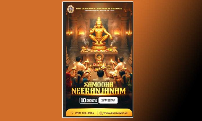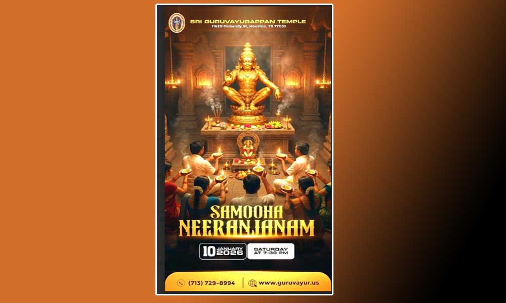 പങ്കെടുക്കുന്നത് ഭക്തർക്ക് അഹങ്കാരം ഉപേക്ഷിക്കാനും വിശ്വാസത്തിന്റെ വിളക്ക് കൊളുത്താനും ആരോഗ്യം, സന്തോഷം, വിജയം എന്നിവയ്ക്കായി ഭഗവാന്റെ കൃപ തേടാനും അനുവദിക്കുന്നു. ഭക്തിസാന്ദ്രമായ ഈ പുണ്യ സമൂഹ നീരാഞ്ജനത്തിൽ പങ്കുചേർന്നു ഈ ധന്യ മുഹൂർത്തം സമ്പന്നമാക്കുവാൻ എല്ലാ ഭക്ത ജനങ്ങളെയും ജാതി മത ഭേദമന്യേ ഓരോരുത്തരെയും സവിനയം സഹർഷം ഹ്യൂസ്റ്റൻ ശ്രീ ഗുരുവായൂരപ്പൻ ക്ഷേത്രത്തിലെ ശ്രീ ധർമ്മ ശാസ്താ സന്നധിയിലേക്കു സ്നേഹാദരങ്ങളോടെ ക്ഷണിച്ചുകൊള്ളുന്നു. : ശനിയാഴ്ച, ജനുവരി 10, 2026 സമയം: വൈകുന്നേരം 7:30 സ്ഥലം: ശ്രീ ഗുരുവായൂരപ്പൻ ക്ഷേത്രം, ഹ്യൂസ്റ്റൺ, കൂടുതൽ വിവരങ്ങൾക്ക് : 713 729 8994, 11620 ഒർമാണ്ടി സ്ട്രീറ്റ്, ഹ്യൂസ്റ്റൺ, TX 77035