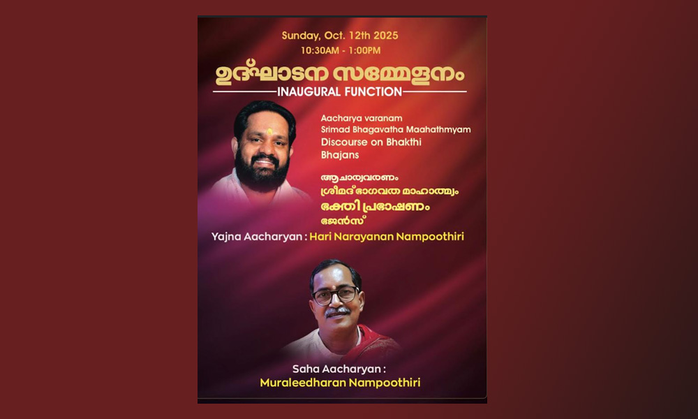 ഹ്യൂസ്റ്റൻ : ശ്രീഗുരുവായൂരപ്പൻ ക്ഷേത്രത്തിന്റെ ആഭിമുഖ്യത്തിൽ ഭക്ത ജനങ്ങളുടെ അഭിലാഷം അനുസരിച്ചു ഈ വർഷം ഒക്ടോബർ മാസം പന്ത്രണ്ടു മുതൽ പത്തൊൻപതുവരെ ( 1201 കന്നി 26 മുതൽ തുലാം 3 വരെ) ശ്രീമത് ഭാഗവത സപ്താഹയജഞം ഭഗവാന്റെ തിരുനടയിൽ നടത്ത പ്പെടുകയാണ്. സാത്വിക ചിന്തകളാൽ മനസ്സും ശരീരവും പാകപ്പെടുത്തി ഭക്തി ജ്ഞാന വൈരാഗ്യങ്ങളുടെ പടികൾ കടന്നു മോചനത്തിന്റെ ബ്രഹ്മസമുദ്രമായ ബ്രഹ്മോഹം എന്നായിത്തീരുവാൻ ഭക്തിസുധാരസമൊഴുകുന്ന ശ്രീമത് ഭാഗവത സപ്താഹ യജഞം കലിയുഗത്തിൽ എത്രമാത്രം സഹായിക്കുമെന്ന് പ്രത്യേകം പറയേണ്ടതില്ലല്ലോ.