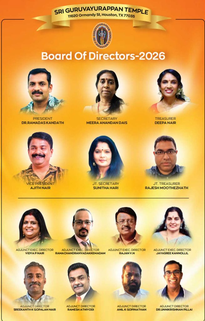 ഭക്തിയും ദിവ്യകാരുണ്യവും നിറഞ്ഞ അന്തരീക്ഷത്തിൽ, ഹ്യൂസ്റ്റൺ ശ്രീ ഗുരുവായൂരപ്പൻ ക്ഷേത്രത്തിന്റെ പുതുതായി തിരഞ്ഞെടുക്കപ്പെട്ട ഡയറക്ടർ ബോർഡ് ഇന്ന് ഔദ്യോഗികമായി ചുമതലയേറ്റു. ധർമ്മം, സേവ, സമൂഹ ഐക്യം എന്നിവയോടുള്ള പുതുക്കിയ പ്രതിബദ്ധതയുടെ പ്രതീകമായ ആത്മീയ ആഘോഷങ്ങളാലും കൂട്ടായ പ്രാർത്ഥനകളാലും ഈ ചടങ്ങ് ശ്രദ്ധേയമായി. .