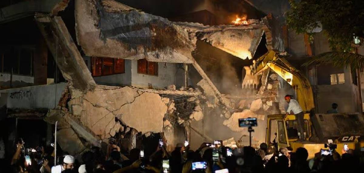 ബുധനാഴ്ച രാത്രി ഒമ്പത് മണിയോടു കൂടിയാണ് ഷെയ്ഖ് ഹസീന സമൂഹ മാധ്യമങ്ങളിലൂടെ ജനങ്ങളെ അഭിസംബോധന ചെയ്തത്. പ്രസംഗം ആരംഭിച്ചതോടെ പ്രതിഷേധക്കാർ ഹസീനയുടെയും ഇവരുടെ പാർട്ടിയായ അവാമി ലീഗിൻ്റെ നേതാക്കളുടെയും വീടുകളിലേക്ക് ഇരച്ച് കയറുകയായിരുന്നു. ഹസീനയുടെ വീട്ടിലെ ചുമരുകൾ പൊളിച്ച് മാറ്റുകയും എസ്കവേറ്ററും ക്രെയിനും ഉപയോഗിച്ച് വീട് പൂർണമായി പൊളിച്ച് മാറ്റുകയുമായിരുന്നു. പിന്നാലെ വീട് തീയിട്ടു. അവാമി ലീഗിൻ്റെ വിദ്യാർത്ഥി വിഭാഗമായ ഛത്ര ലീഗ് സംഘടിപ്പിച്ച പരിപാടിയിൽ സംസാരിച്ചതിന് പിന്നാലെയാണ് കലാപം പൊട്ടിപുറപ്പെട്ടത്.