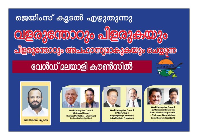 വളരുന്തോറും പിളരുകയും പിളരുന്തോറും അപഹാസ്യമാകുകയും ചെയ്യുകയാണ് സംഘടന ഇന്ന്. ഏറ്റവും വലിയ മലയാളികളുടെ കൂട്ടായ്മ എന്ന പേരെടുത്ത സംഘടനയാണ് ഇന്ന് ഇത്തരത്തിൽ 3 സംഘനകളായി ചേരിതിരിഞ്ഞ് മാറുന്നത്. ലോകമെമ്പാടുമുള്ള മലയാളികളുടെ സാമ്പത്തിക, രാഷ്ട്രീയ, സാമൂഹിക വളർച്ചയ്ക്ക് പുതിയ സാധ്യതകൾ തുറക്കുന്നതിനും നമ്മുടെ സാംസ്കാരിക മൂല്യങ്ങൾ ഉയർത്തിപ്പിടിക്കുന്നതിനുമുള്ള ഒരു സംഗമസ്ഥാനമാണ് ഇന്ന് ഈ സ്ഥിതിയിലായിരിക്കുന്നത്. കഴിഞ്ഞ 30 വർഷത്തിനിടയിൽ ഡബ്ലിയു.എം.സി ശ്രദ്ധേയമായ ഒട്ടേറെ പ്രവർത്തനങ്ങൾ കാഴ്ചവച്ചിരുന്നു. ഒരുഘട്ടത്തിൽ മറ്റ് സാംസ്കാരിക സാമൂഹിക അസോസിയേഷനുകളിൽ നിന്ന് വ്യത്യസ്തമായി ചാരിറ്റിക്കും കലാപരിപാടികൾക്കും ആഘോഷങ്ങൾക്കുമപ്പുറം തൊഴിൽപരമായ മുന്നേറ്റത്തിനും ഡബ്ലിയു എം.സി ഊന്നൽ നൽകിയിരുന്നു. വികസ്വര രാജ്യങ്ങളിലും വികസിത രാജ്യങ്ങളിലും നിന്ന് മലയാളികൾ നേടിയെടുത്ത അനുഭവവും അറിവും കഴിവും സാമർത്ഥ്യവും ബുദ്ധിശക്തിയും വൈദഗ്ദ്ധ്യവും സംരംഭകത്വവും മറ്റൊരു മലയാളിക്കുകൂടി ഉപകരിക്കണമെന്ന ചിന്ത സംഘടനയിൽ ഉള്ളവർക്ക് വേണ്ടത് അനിവാര്യമാണ്. മാറ്റി ചിന്തിക്കാനും പ്രവർത്തിക്കുവാനും ഇനിയും സമയമുണ്ട്. ഇതേ കാലഘട്ടത്തിൽ രൂപം കൊണ്ട മറ്റു സംഘടനകൾ മാതൃകാപരമായ പ്രവർത്തനങ്ങൾ നടത്തി മുന്നോട്ടുപോകുമ്പോഴാണ് വേൾഡ് മലയാളി കൗൺസിലിന്റെ ഈ അപചയം എന്ന് ആലോചിക്കേണ്ടതാണ്. ഇതിനൊരു മാറ്റം കൊണ്ടുവരേണ്ട സമയം അതിക്രമിച്ചു കഴിഞ്ഞു. ഒന്നിച്ചു നിൽക്കേണ്ടവർ ഭിന്നിച്ചപ്പോൾ ബാക്കിയായത് അപമാനവും ചീത്തപ്പേരും മാത്രമാണ്.വേൾഡ് മലയാളി കൗൺസിലിന്റെ 3 ഗ്രൂപ്പുകളും 50 രാജ്യങ്ങളിലായി 70 പ്രൊവിൻഡുകൾ ഉണ്ടെന്നാണ് വാദിക്കുന്നത്. എന്തിന്റെ അടിസ്ഥാനത്തിലാണിത് ? സത്യം തിരിച്ചറിയാനുള്ള ബോധം മലയാളിക്ക് ഇല്ലെന്ന് ധരിക്കുന്നത് അപഹാസ്യമാണ്. വിവേകമുള്ള മലയാളികൾ പരിഹസിക്കുക തന്നെ ചെയ്യും. നിരവധി പ്രവർത്തനങ്ങൾ സാമൂഹിക പുരോഗതിക്കായി ചെയ്യാൻ കഴിയുന്ന സംഘടനയാണ് ഇത്തരത്തിൽ അധപ്പതിക്കുന്നത്.
