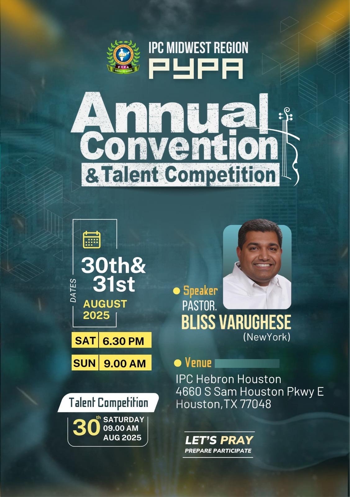 ഹൂസ്റ്റൺ: ഐപിസി മിഡ്വെസ്റ്റ് റീജിയൻ പി.വൈ.പി.എ കൺവൻഷൻ 2025 ആഗസ്റ്റ് 30 മുതൽ 31 വരെ ഹൂസ്റ്റണിലെ ഐപിസി ഹെബ്രോൻ സഭയിൽ നടക്കും.