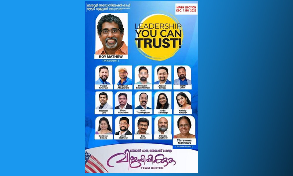 സ്റ്റാഫോർഡ്, ടെക്സസ്: മലയാളി അസോസിയേഷൻ ഓഫ് ഗ്രേറ്റർ ഹ്യൂസ്റ്റൺ (MAGH) 2026-ലെ തെരഞ്ഞെടുപ്പ് പ്രചാരണങ്ങൾക്ക് ആവേശകരമായ തുടക്കം കുറിച്ചുകൊണ്ട്, പ്രസിഡന്റ് സ്ഥാനാർത്ഥി റോയ് മാത്യു നയിക്കുന്ന ടീം യുണൈറ്റഡിന്റെ കിക്ക്-ഓഫ് ചടങ്ങ് സ്റ്റാഫോർഡിലെ കേരള ഹൗസിൽ വച്ച് പ്രൗഢഗംഭീരമായി നടന്നു. ഹ്യൂസ്റ്റണിലെ മലയാളി സമൂഹത്തിൻ്റെ അഭൂതപൂർവമായ പങ്കാളിത്തം കൊണ്ട് ശ്രദ്ധേയമായ ഈ പരിപാടി, വരാനിരിക്കുന്ന തെരഞ്ഞെടുപ്പിൻ്റെ ആവേശം വാനോളമുയർത്തി. ടീം യുണൈറ്റഡിന് ലഭിച്ച വൻ ജനപിന്തുണ, പ്രചാരണത്തിൻ്റെ ആദ്യ ഘട്ടത്തിൽ തന്നെ അവർക്ക് വ്യക്തമായ മുൻതൂക്കം നൽകിയിരിക്കുകയാണ്. ചടങ്ങിന് മാറ്റുകൂട്ടാനായി സാമൂഹിക-സാംസ്കാരിക രംഗത്തെ നിരവധി പ്രമുഖർ എത്തിച്ചേർന്നു.