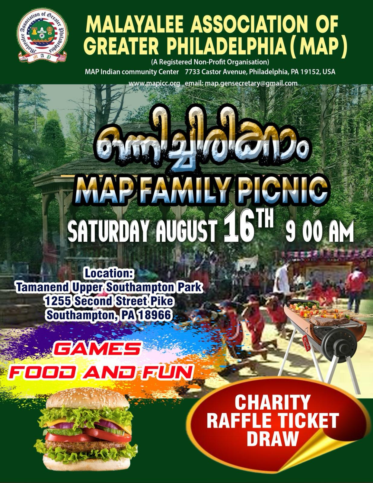 ഫിലഡൽഫിയാ: മലയാളീ അസോസിയേഷൻ ഓഫ് ഗ്രെയ്റ്റർ ഫിലഡൽഫിയായുടെ (മാപ്പ്) പിക്ക്നിക്കും, ചാരിറ്റി റാഫിൾ ടിക്കറ്റ് നറുക്കെടുപ്പും ഓഗസ്റ്റ് 16 – ന് ശനിയാഴ്ച രാവിലെ ഒൻപത് മുതൽ വൈകിട്ട് നാല് വരെ സെക്കന്റ് സ്ട്രീറ്റ് പൈക്കിലുള്ള റ്റാമനെന്റ് പാർക്കിൽ വച്ച് നടത്തപ്പെടുന്നു. (Tamanend Park , 1255 Second Street Pike, Southampton , PA 18966).
