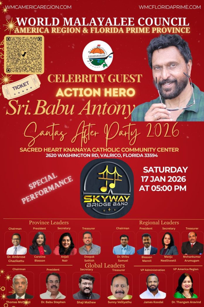 ടാമ്പ (ഫ്ലോറിഡ): ലോക മലയാളി കൗൺസിലിന്റെ നേതൃത്വത്തിൽ അമേരിക്ക മേഖലയും ഫ്ലോറിഡ പ്രൈം പ്രവിശ്യയും ചേർന്ന് സംഘടിപ്പിക്കുന്ന പുതുവത്സര സൗഹൃദ–സാംസ്കാരിക സംഗമം ‘സാന്റാസ് ആഫ്റ്റർ പാർട്ടി 2026’ ജനുവരി 17-ന് ടാമ്പയിൽ നടക്കും.
