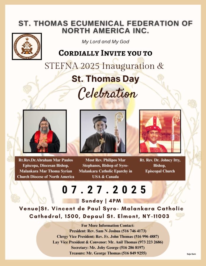 ന്യൂയോർക്ക് :  ന്യൂയോർക്ക് ആസ്ഥാനമായി പ്രവർത്തിക്കുന്ന മലയാളി ക്രൈസ്‌തവ കൂട്ടായ്മയായ സെന്റ്. തോമസ് എക്യൂമെനിക്കൽ ഫെഡറേഷൻ ഓഫ് നോർത്ത് അമേരിക്ക (STEFNA) യുടെ 2025–26 വർഷത്തെ പ്രവർത്തനോദ്ഘാടനവും സെന്റ്. തോമസ് ദിനാചരണവും 2025 ജൂലൈ 27-നു, ഞായറാഴ്ച വൈകിട്ട് 4:00 മണിക്ക് സെൻറ്. വിൻസെൻറ് ഡി പോൾ സീറോ മലങ്കര കാത്തോലിക്ക കത്തീഡ്രൽ ദേവാലയത്തിൽ  വെച്ചു നടക്കും.
