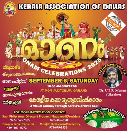 ഡാളസ്: കേരള അസോസിയേഷൻ ഓഫ് ഡാളസ് സംഘടിപ്പിക്കുന്ന ഓണാഘോഷം – 2025, സെപ്റ്റംബർ 6-ന് രാവിലെ 10 മണിക്ക് മാർ ഗ്രിഗോറിയോസ് മെമ്മോറിയൽ ഹാളിൽ വെച്ച് (MGM Hall) വെച്ച് നടക്കും. വൈവിധ്യമാർന്ന കലാപരിപാടികളോടെയാണ് ഇത്തവണത്തെ ഓണാഘോഷം ഒരുക്കിയിരിക്കുന്നത്.