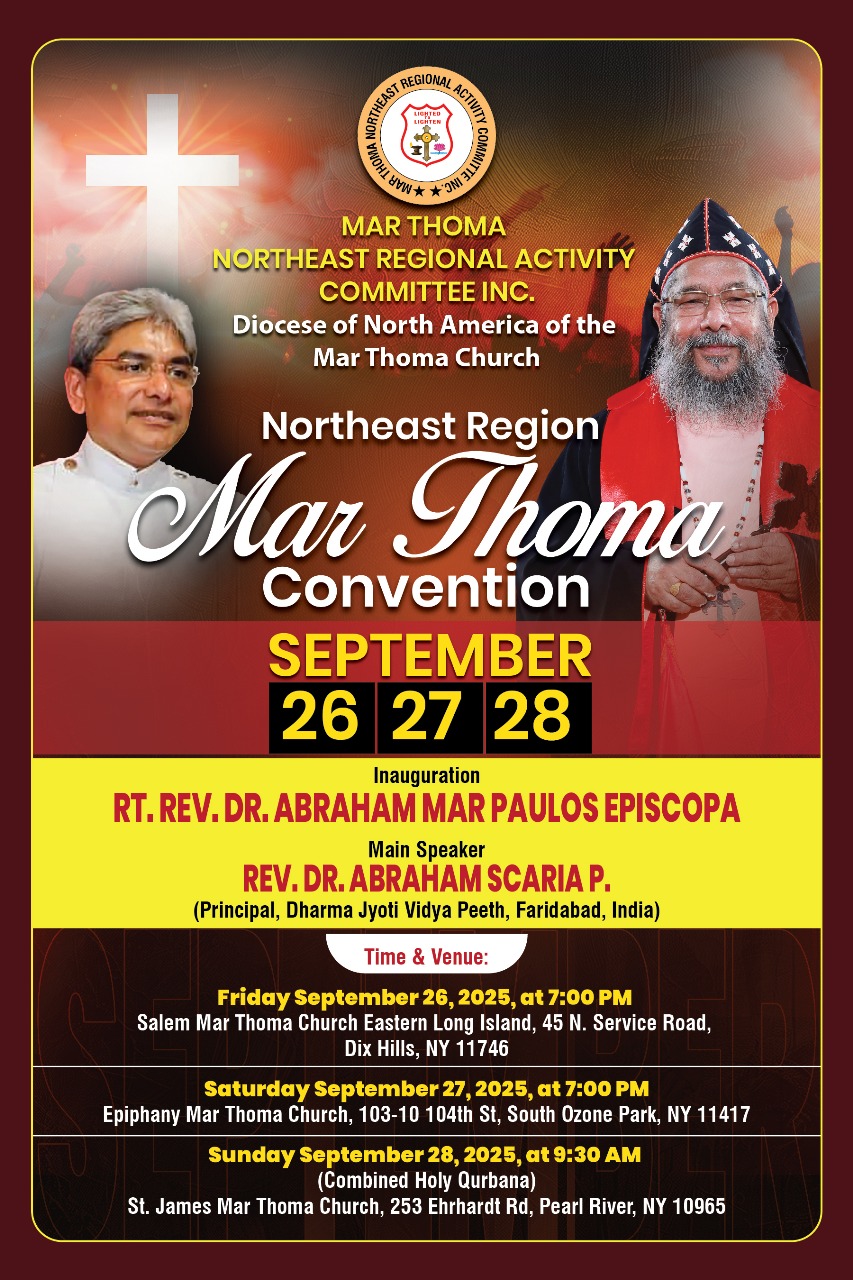 ന്യൂ യോർക്ക്: മാർത്തോമ്മാ സഭയുടെ വടക്കേ അമേരിക്ക ഭദ്രാസനത്തിൽ അമേരിക്കയുടെ വടക്ക് കിഴക്കൻ സംസ്ഥാനങ്ങളിലുൾപ്പെട്ട ഇടവകകളുടെ സംയുക്താഭിമുഖ്യത്തിൽ (മാർത്തോമ്മ നോർത്ത് ഈസ്റ്റ് റീജിയണൽ ആക്റ്റിവിറ്റി കമ്മിറ്റി) ഈ വർഷത്തെ റീജിയണൽ കൺവെൻഷൻ സെപ്റ്റംബർ മാസം 26, 27, 28 എന്നീ തീയതികളിൽ യഥാക്രമം ശാലേം മാർത്തോമ്മാ പള്ളി ഈസ്റ്റേൺ ലോങ്ങ് ഐലൻഡ്, എപ്പിഫനി മാർത്തോമ്മാ പള്ളി (ഓസോൺ പാർക്ക്) , സെൻറ്. ജെയിംസ് മാർത്തോമ്മാ പള്ളി (റോക്ക് ലാൻഡ്), എന്നിവിടങ്ങളിൽ വച്ചു നടത്തപ്പെടുന്നു.