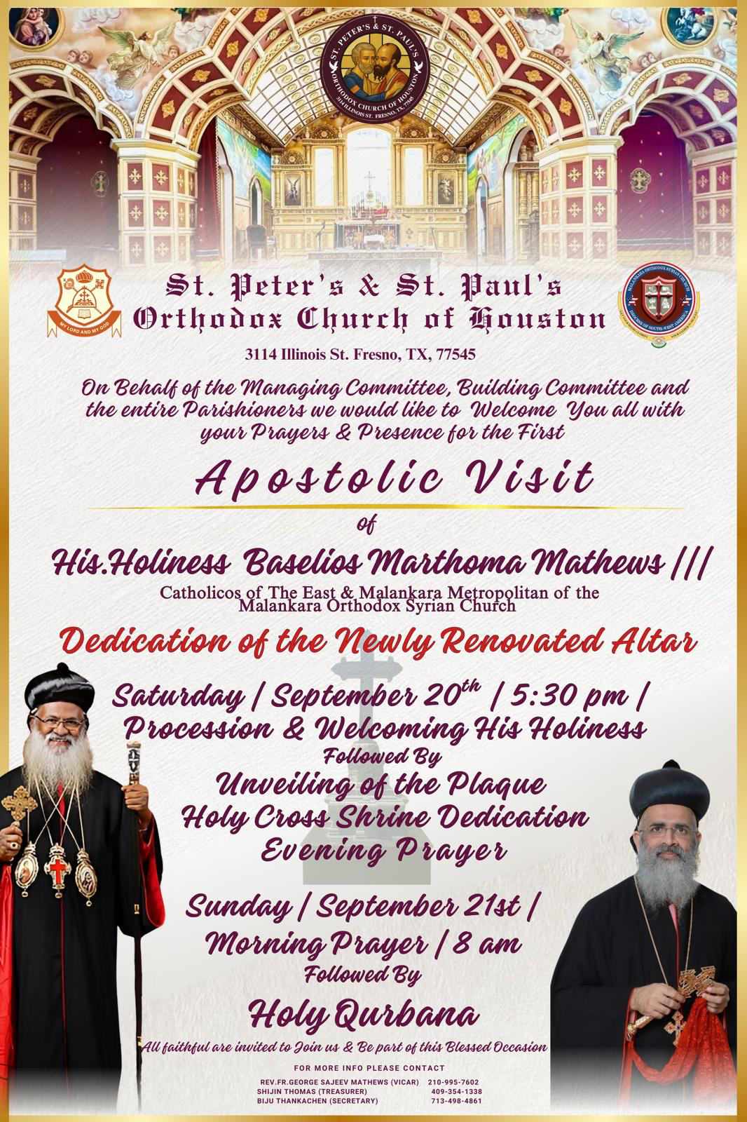 പരിശുദ്ധ കാതോലിക്ക ബാവയുടെ ഹൂസ്റ്റൺ സന്ദർശനം സെപ്റ്റംബർ 20 മുതൽ; സെന്റ് പീറ്റേഴ്സ് ആൻഡ് സെന്റ് പോൾസ് ഇടവകയുടെ പുനഃപ്രതിഷ്ഠയും കൽക്കുരിശ്  കൂദാശയും