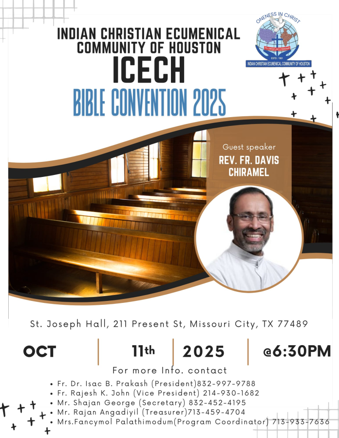 ഹൂസ്റ്റൺ: ഇന്ത്യൻ ക്രിസ്ത്യൻ എക്യൂമെനിക്കൽ കമ്മ്യൂണിറ്റി ഓഫ് ഹൂസ്റ്റൺ (ICECH) ആഭിമുഖ്യത്തിൽ 2025-ലെ ബൈബിൾ കൺവെൻഷൻ ഹൂസ്റ്റൺ സെന്റ് ജോസഫ് സീറോ മലബാർ കാത്തലിക് ദേവാലയ ഹാളിൽ ഒക്ടോബർ 11-ാം തീയതി ശനിയാഴ്ച നടത്തപ്പെടുന്നു. വൈകുന്നേരം 6:30 യ്ക്ക് കൺവെൻഷൻ ആരംഭിക്കും