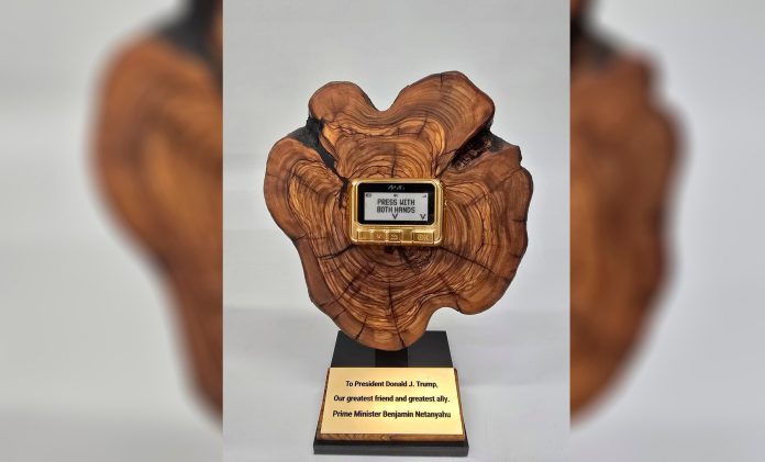 വാഷിങ്ടൺ: യു.എസ് പ്രസിഡണ്ട് ഡോണൾഡ് ട്രംപിന് സ്വർണത്തിൽ തീർത്ത പേജർ സമ്മാനമായി നൽകി ഇസ്രായേൽ പ്രധാനമന്ത്രി ബെൻയമിൻ നെതന്യാഹു. ‘ഞങ്ങളുടെ ഏറ്റവും വലിയ സഖ്യകക്ഷിയും സുഹൃത്തുമായ പ്രസിഡണ്ട് ഡൊണാൾഡ് ട്രംപിന്’ എന്നു രേഖപ്പെടുത്തിയ ഫലകത്തോടൊപ്പമാണ് ഒലിവ് മരത്തടിയുടെ ഫലകത്തിൽ സ്ഥാപിച്ച പേജർ കൈമാറിയത്. കഴിഞ്ഞ വർഷം ലബനാനിൽ ഹിസ്ബുല്ലയെ ലക്ഷ്യമിട്ട് ഇസ്രായേൽ നടത്തിയ പേജർ ആക്രമണത്തിന്റെ സ്മരണാർത്ഥമാണ് സമ്മാനം.