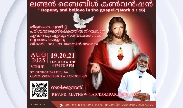 മലയാളി വിശ്വാസി സമൂഹത്തിന്റെ ആത്മീയ വെളിച്ചമായി പതിറ്റാണ്ടുകളായി പ്രകാശിക്കുന്ന പ്രശസ്ത വചന പ്രഘോഷകനും രോഗശാന്തി ശുശ്രൂഷകനുമായ മാത്യു നായ്കാം പറമ്പിൽ അച്ചന്റെ നേതൃത്വത്തിൽ ഒന്റാരിയോ ലണ്ടൻ 1164 കമ്മീഷണർ റോഡ് വെസ്റ്റ് സെന്റ് ജോർജ്ജ് പാരിഷിൽ വെച്ചാണ് ഈ ആത്മീയ ശുശ്രൂഷ നടത്തപ്പെടുന്നത്. കഴിഞ്ഞ കാലങ്ങളിൽ വടക്കേ അമേരിക്കയിൽ പല നഗരങ്ങളിലും നായ്ക്കാംപറമ്പിൽ അച്ചന്റെ വചന ശുശ്രൂഷ നടത്തപ്പെട്ടിട്ടുണ്ടെങ്കിലും ലണ്ടൻ പ്രദേശത്തു ഈ ആത്മീയ കൂട്ടായ്മ ആദ്യമായിട്ടാണ്. അത് കൊണ്ട് തന്നെ ഈ ബൈബിൾ കൺവെൻഷനെ കുറിച്ചുള്ള വാർത്തകൾ ഇതിനോടകം സഭാഭേദമന്യേ വിശ്വാസികൾക്കിടയിൽ വലിയ ഉണർവും താല്പര്യവും സൃഷ്ടിച്ചു കഴിഞ്ഞതായും ഇതുവരെ അതിൽ പങ്കെടുക്കുവാൻ വേണ്ടി രജിസ്റ്റർ ചെയ്ത വിശ്വാസികളുടെ എണ്ണം അതാണ് വ്യകതമാക്കുന്നത് എന്നും ഭാരവാഹികൾ അറിയിച്ചു. കൺവെൻഷനിൽ പങ്കെടുക്കുവാൻ ഉള്ള റജിസ്ട്രേഷൻ താഴെ കൊടുത്തിരിക്കുന്ന വെബ് ലിങ്ക് വഴി ഓൺലൈൻ ആയി പൂർത്തിയാക്കാവുന്നതാണ്. സെന്റ്. തോമസ് മലങ്കര കത്തോലിക്ക ദേവാലയം ഇടവക വികാരി, ഫാദർ ജോബിൻ തോമസിന്റെയും മറ്റു പാരിഷ് കമ്മിറ്റി അംഗങ്ങളുടെയും നേതൃത്വത്തിൽ ആണ് കൺവെൻഷനു വേണ്ട ഒരുക്കങ്ങൾ അതിവേഗം പൂർത്തിയായികൊണ്ടിരിക്കുന്നത്. പ്രസ്തുത കൺവെൻഷന്റെ അനുഗ്രഹകരമായ നടത്തിപ്പിന് വേണ്ടി എല്ലാവരുടെയും പ്രാർത്ഥന സഹായങ്ങൾ അഭ്യർത്ഥിക്കുന്നതായി ഫാ. ജോബിൻ തോമസ് ഇടവകക്ക് വേണ്ടി അറിയിച്ചു.