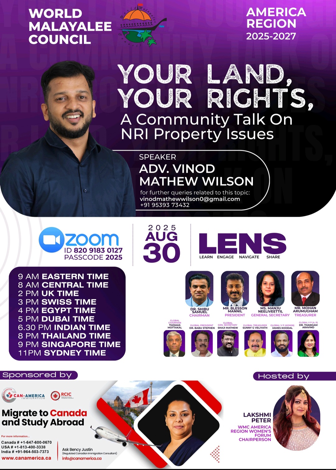 വിഷയം: “നിങ്ങളുടെ ഭൂമി, നിങ്ങളുടെ അവകാശം”. എൻ.ആർ.ഐ. ഉത്തരവാദിത്വം / വസ്തു സംബന്ധിച്ച നിയമപ്രശ്നങ്ങൾ,