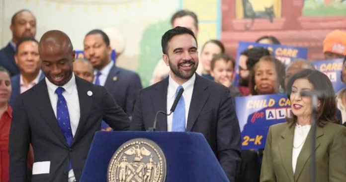 ന്യൂയോർക്ക് ഗവർണർ കാത്തി ഹോക്കലും മേയർ സോഹ്റാൻ മംദാനിയും ചേർന്ന് നഗരത്തിലെ രണ്ട് വയസ്സുള്ള കുട്ടികൾക്കായി സൗജന്യ ശിശുപരിചരണ പദ്ധതി പ്രഖ്യാപിച്ചു. വരുമാനമോ, താമസിക്കുന്ന സ്ഥലമോ, ഇമിഗ്രേഷൻ പദവിയോ നോക്കാതെ എല്ലാവർക്കും ഈ സേവനം ലഭ്യമാക്കുമെന്നാണ് പ്രഖ്യാപനം.