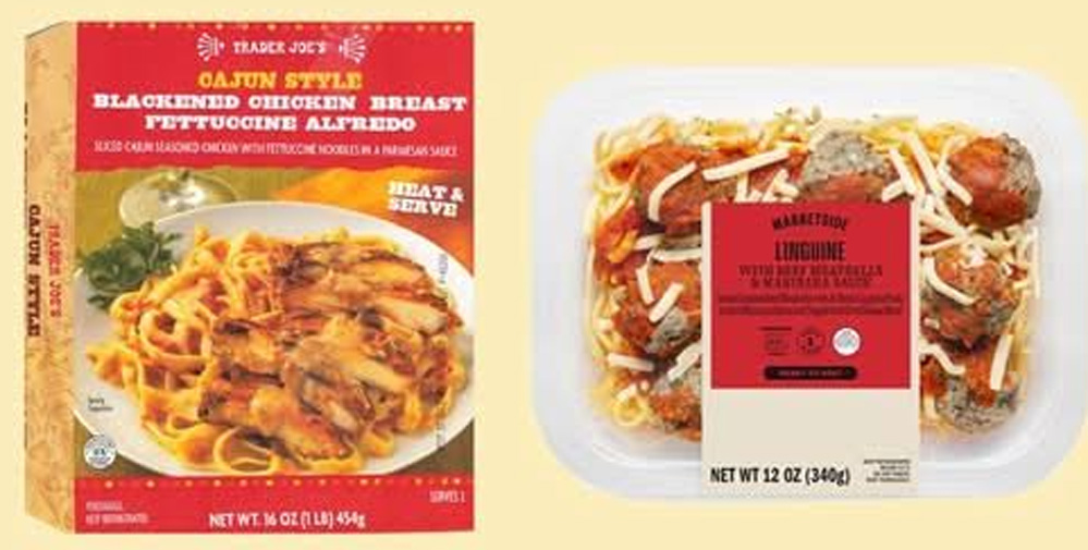 ട്രേഡർ ജോസിന്റെ കാജുൻ സ്റ്റൈൽ ബ്ലാക്ക്നെഡ് ചിക്കൻ ബ്രെസ്റ്റ് ഫെറ്റൂസിൻ ആൽഫ്രെഡോ, മാർക്കറ്റ്സൈഡ് ലിംഗ്വിൻ വിത്ത് ബീഫ് മീറ്റ്ബോൾസ് & മരിനാര സോസ് എന്നിവ തിരിച്ചുവിളിക്കപ്പെടുന്ന തയ്യാറാക്കിയ പാസ്ത ഭക്ഷണങ്ങളിൽ ഉൾപ്പെടുന്നു.