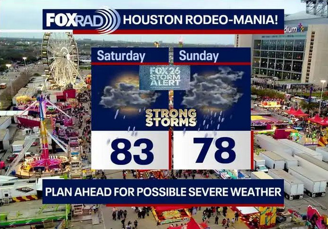 ഹൂസ്റ്റൺ:ഈ വാരാന്ത്യത്തിൽ ഹൂസ്റ്റൺ നഗരത്തിലും പരിസരപ്രദേശങ്ങളിലും അതിശക്തമായ ഇടിമിന്നലോടു കൂടിയ മഴയ്ക്കും കാറ്റിനും സാധ്യതയുണ്ടെന്ന് കാലാവസ്ഥാ നിരീക്ഷണ കേന്ദ്രം മുന്നറിയിപ്പ് നൽകി. നിലവിൽ ഹൂസ്റ്റണിൽ നടന്നുവരുന്ന പ്രശസ്തമായ ‘ലൈവ്സ്റ്റോക്ക് ഷോ ആൻഡ് റോഡിയോ’ (Rodeo) പരിപാടികളെ ഈ കാലാവസ്ഥ ബാധിക്കാൻ സാധ്യതയുണ്ട്.