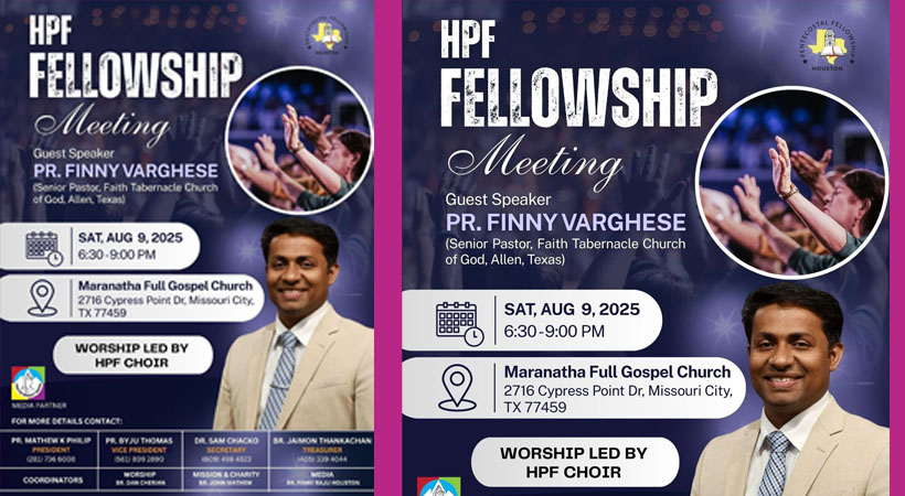 ഹ്യൂസ്റ്റൺ: ഹ്യൂസ്റ്റൺ പെന്തക്കോസ്ത് ഫെലോഷിപ്പിന്റെ ആഭിമുഖ്യത്തിൽ ആഗസ്റ്റ് 9, 2025 ശനിയാഴ്ച വൈകിട്ട് 6:30 മുതൽ 9:00 വരെ ഫെലോഷിപ്പ് മീറ്റിംഗ് നടത്തപ്പെടുന്നു. മീറ്റിംഗ് മിസൗറി സിറ്റിയിലെ Maranatha Full Gospel Church ൽ വെച്ച് നടത്തപ്പെടും. (വിലാസം: 2716 Cypress Point Dr, Missouri City, TX 77459)