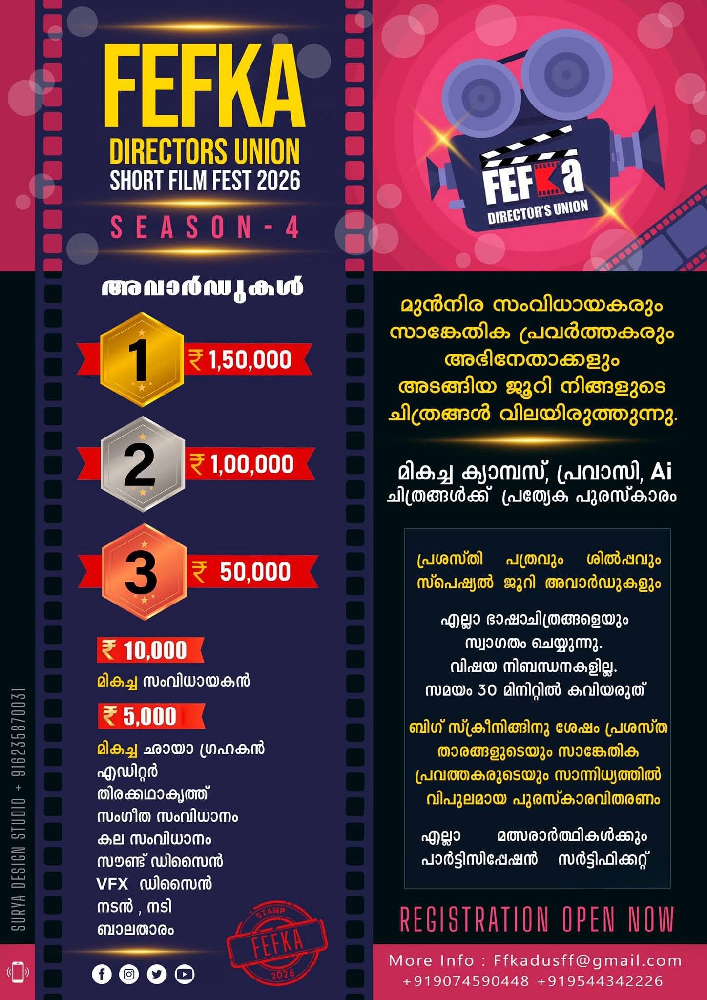 ഹ്രസ്വ ചിത്രങ്ങളുടെ കേരളത്തിലെ ഏറ്റവും വലിയ മത്സരവേദിയായ ഫെഫ്ക ഷോർട്ട് ഫിലിം ഫെസ്റ്റിൽ ഈ വർഷം മുതൽ മികച്ച ഷോർട്ട് ഫിലിമിന് ഒന്നര ലക്ഷം രൂപയും (150000/- )