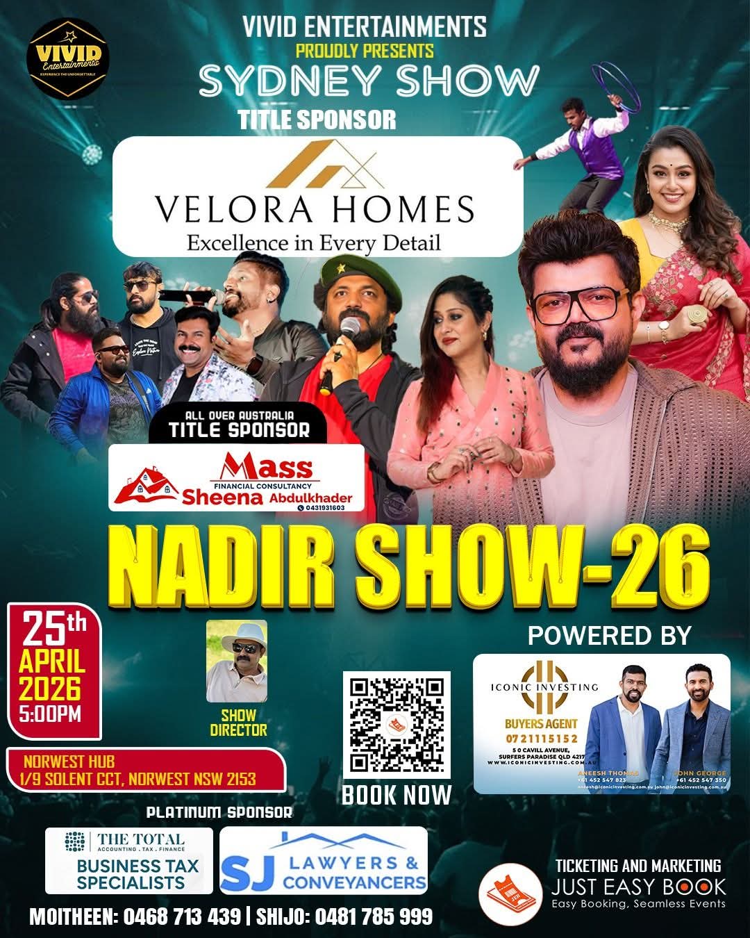 ടിക്കറ്റ് ബുക്ക് ചെയ്യാനുള്ള ലിങ്ക്: https://justeasybook.com/events/nadirshowsydney