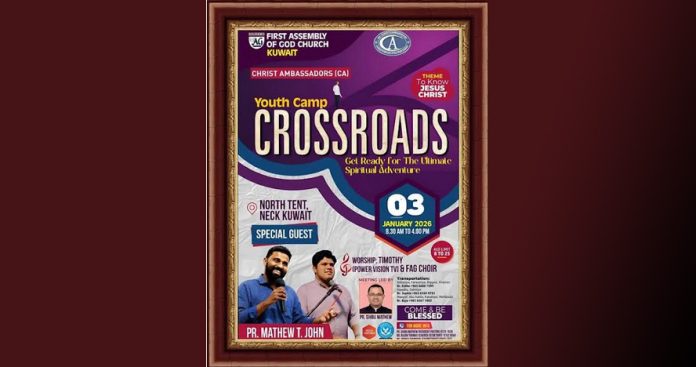 കുവൈറ്റ്‌ സിറ്റി : ഫസ്റ്റ് അസംബ്ലി ഓഫ് ഗോഡ് ചർച്ച് കുവൈറ്റ്‌ സഭയുടെ യുവജന വിഭാഗമായ ക്രൈസ്റ്റ് അംബാസ്സഡർസ് (സി എ) 8 വയസ്സ് മുതൽ 25 വയസ്സ് വരെയുള്ള യുവജനങ്ങൾക്ക് വേണ്ടി പ്രത്യേകമായി ഒരുക്കുന്ന യൂത്ത് ക്യാമ്പ് “CrossRoads” 2026 ജനുവരി 3 ശനിയാഴ്ച്ച കുവൈറ്റ്‌ സിറ്റിയിലുള്ള നാഷണൽ ഇവാൻജെലിക്കൽ ചർച്ച് കോമ്പൗണ്ടിലെ (എൻ ഇ സി കെ) നോർത്ത് റ്റെൻറ്റിൽ വച്ച് രാവിലെ 8.30 മണി മുതൽ വൈകിട്ട് 4 മണി വരെ നടക്കും.
