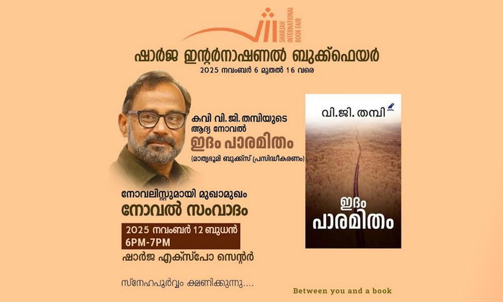 നവംബർ 12-ന്, ബുധനാഴ്ച, വൈകുന്നേരം 6 മണി മുതൽ 7 മണി വരെ,മുൻ കേരള വർമ്മ കോളേജ് പ്രൊ:പി വി തമ്പിയുടെ പ്രഥമ നോവൽ ‘ഇദം പാരമിതം’ എന്ന സംവാദം സംഘടിപ്പിക്കും. കൂടാതെ, റോസിയുടെ “റബ്ബോണി” നോവലിന്റെ പുതിയ പതിപ്പിന്റെ പ്രകാശനവും വേദിയിൽ നടത്തപ്പെടും. UAE-യിൽ ഉള്ള സുഹൃത്തുക്കളെയും വായനക്കാരെയും കാണുന്നതിൽ വലിയ അഭിമാനമുണ്ടെന്ന് പ്രൊ:പി വി തമ്പി പറഞ്ഞു