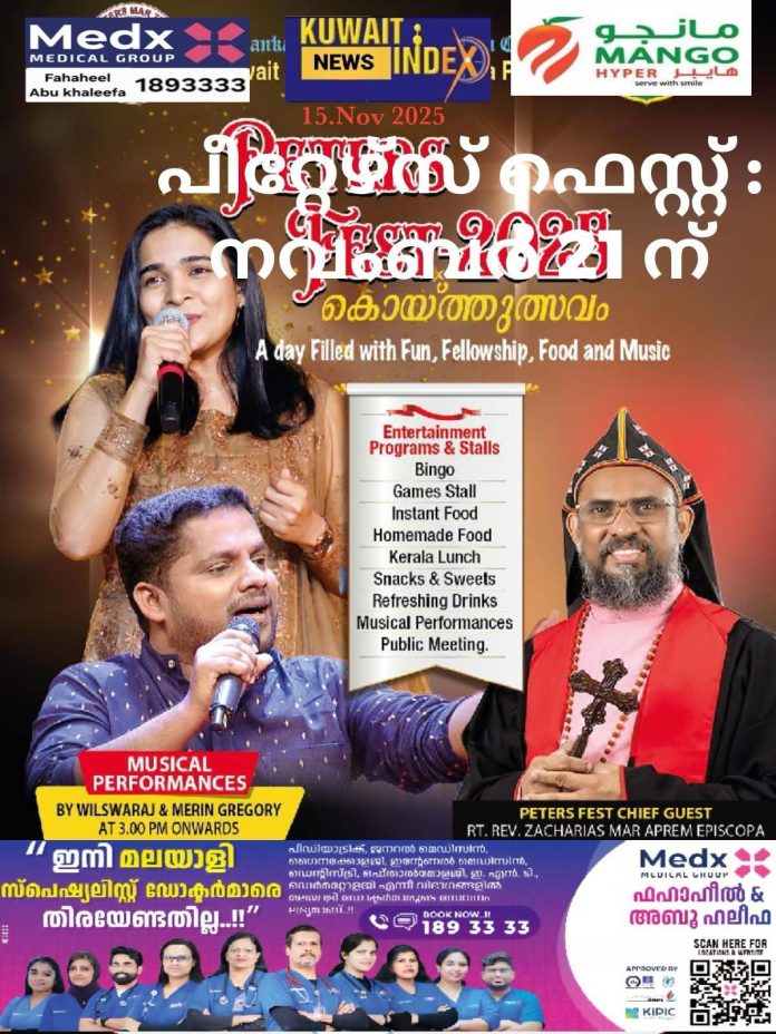 കുവൈത്ത് സിറ്റി : കുവൈത്ത് സെന്റ് പീറ്റേഴ്സ് മാർത്തോമാ ഇടവകയുടെ ഹാർവെസ്ററ് ഫെസ്റ്റിവൽ നവംബർ മാസം 21-തീയതി വെള്ളിയാഴ്ച രാവിലെ 8 മണി മുതൽ വൈകിട്ട് 6.30 വരെ അബ്ബാസിയ ആസ്പെയർ ഇന്ത്യൻ ഇന്റർനാഷണൽ സ്കൂളിൽ വച്ച് നടക്കും. വിശിഷ്ടാതിഥിയായി ഡൽഹി ഭദ്രാസനാധിപൻ റൈറ്റ് റവ .സക്കറിയാസ് മാർ അപ്രേം എപ്പിസ്കോപ്പാ പങ്കെടുക്കുന്ന പരിപാടിയിൽ .