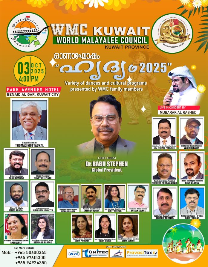 കുവൈറ്റ്: വേൾഡ് മലയാളി കൗൺസിൽ കുവൈറ്റ് ചാപ്റ്റർ ഓണാഘോഷം “ഹൃദ്യ 2025” എന്ന പേരിൽ ഒക്ടോബർ 3 ന് വൈകുന്നേരം നാലിന് ബെനൈദ് അൽ ഗാറിലെ പാർക്ക് അവന്യൂസ് ഹോട്ടലിൽ സംഘടിപ്പിക്കും. അംഗങ്ങൾ അവതരിപ്പിക്കുന്ന പരമ്പരാഗത നൃത്തങ്ങൾ, സംഗീതം, സാംസ്കാരിക പരിപാടികൾ എന്നിവ അരങ്ങേറും. മുബാറക് അൽ റഷീദിന്റെ തത്സമയ സംഗീത കച്ചേരി പരിപാടിക്ക് മിഴിവേകും. ഗ്ലോബൽ പ്രസിഡന്റ് ഡോ. ബാബു സ്റ്റീഫനെ ചടങ്ങിൽ ആദരിക്കും. ഡബ്ല്യുഎംസി നേതാക്കൾ ചടങ്ങിൽ പങ്കെടുക്കും.
