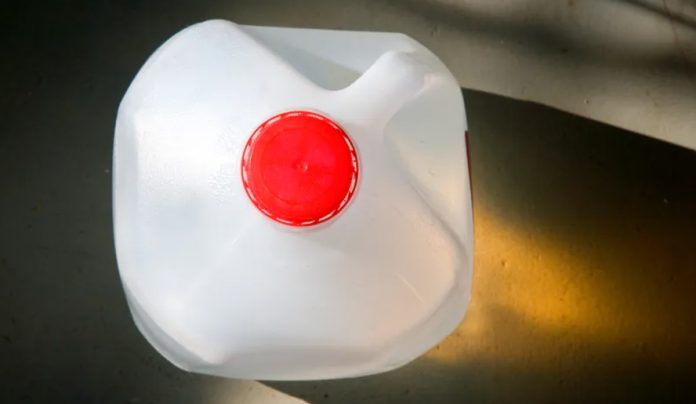 അടയാളം: ചുവന്ന പ്ലാസ്റ്റിക് അടപ്പുള്ള ഒരു ഗാലൻ കാനുകൾ.