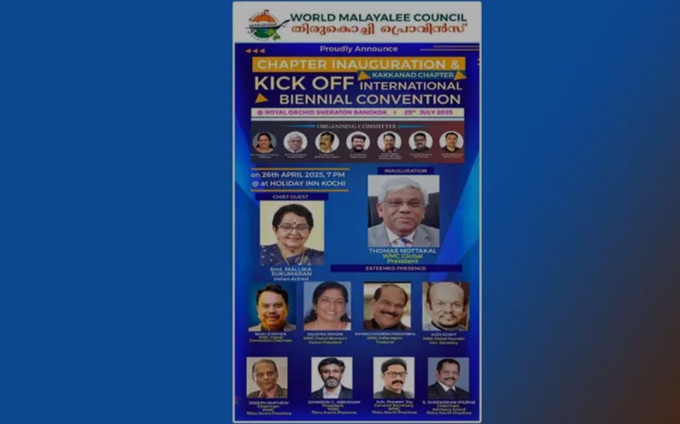 ഇന്റർനാഷണൽ കൺവൻഷൻ ബാങ്കോക്കിലെ റോയൽ ഓർക്കിഡ് ഷെറാട്ടണിൽ ജൂലൈ 25, 2025 ന് നടക്കുമെന്ന് ഓർഗനൈസിംഗ് കമ്മിറ്റി അംഗങ്ങളായ തങ്കമണി ദിവാകരൻ(ചെയർപേഴ്സൺ),തോമസ് മൊട്ടയ്ക്കൽ(ഗ്ലോബൽ പ്രസിഡന്റ്), ദിനേശ് നായർ(ഗ്ലോബൽ സെക്രട്ടറി ജനറൽ),ഷാജി മാത്യു(ഗ്ലോബൽ ട്രഷറർ),ഡോ.ബാബു സ്റ്റീഫൻ (ഗ്ലോബൽ കോൺഫറൻസ് കമ്മിറ്റി ചെയർമാൻ),കണ്ണാട്ട് സുരേന്ദ്രൻ(വൈസ് ചെയർമാൻ) എന്നിവർ അറിയിച്ചു.