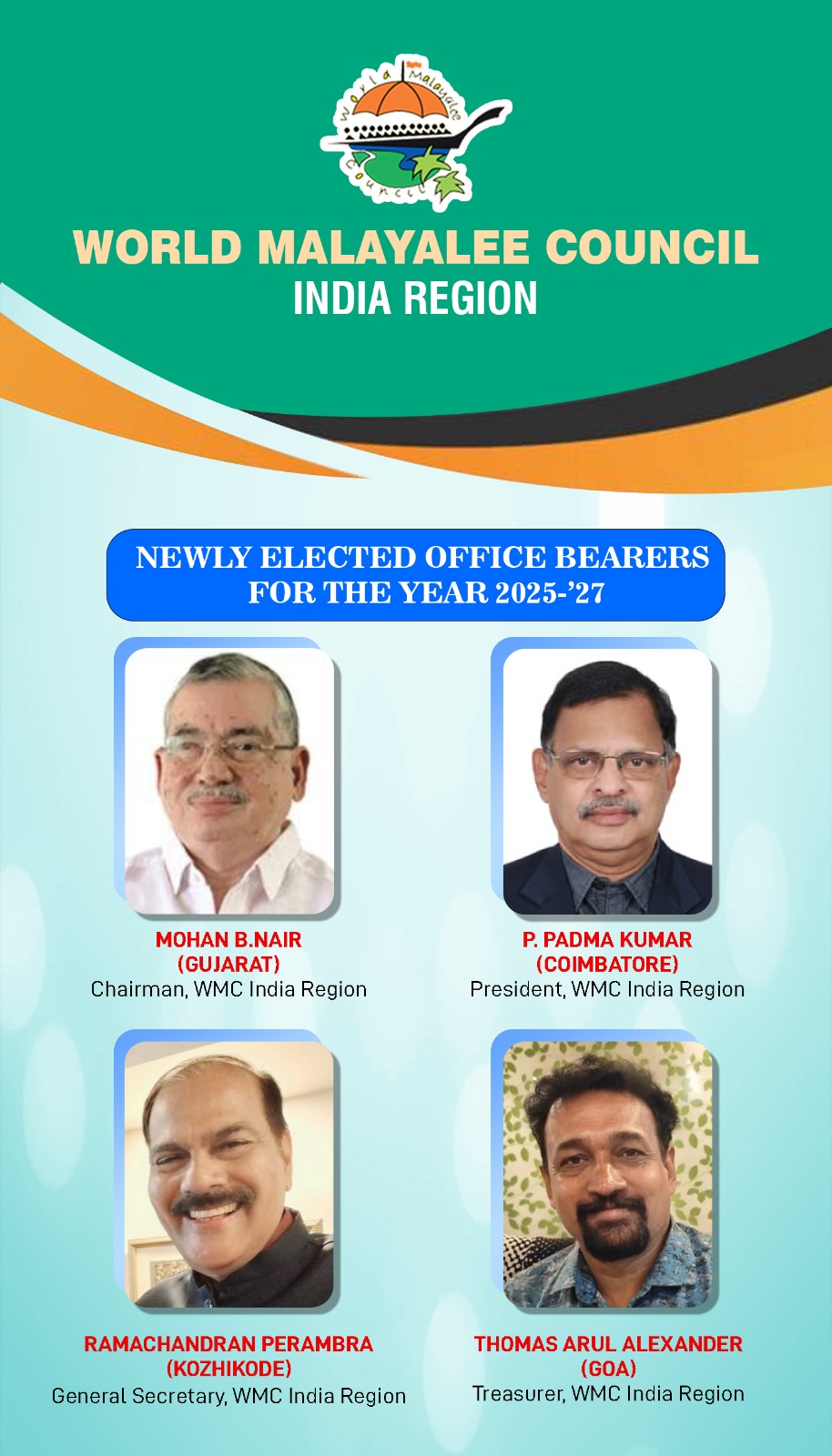 വേൾഡ് മലയാളി കൗൺസിൽ ഇന്ത്യ റീജിയൻ പുതിയ ഭാരവാഹികളെ തിരഞ്ഞെടുത്തു