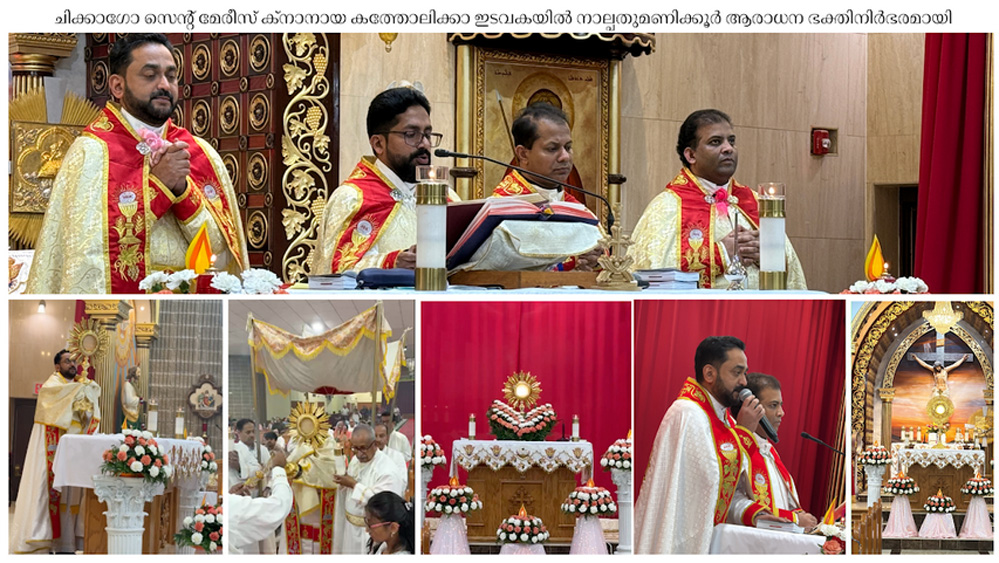 ചിക്കാഗോ: ചിക്കാഗോ സെന്റ് മേരീസ് ക്നാനായ കത്തോലിക്കാ ഇടവകയിൽ നടത്തപ്പെട്ട നാല്പതുമണിക്കൂർ ആരാധന ഭക്തിനിർഭരമായി സമാപിച്ചു. നവംബർ 28 വെള്ളിയാഴ്ച്ച വൈകിട്ട് ആറുമണിക്ക് ദിവ്യബലിയോട് കൂടി ആരംഭിച്ച് നവംബർ 30 ഞായറാഴ്ച ഉച്ചയോടുകൂടിയാണ് നാൽപ്പത് മണയ്ക്കൂർ ആരാധനയുടെ തിരുക്കർമ്മങ്ങൾ സമാപിച്ചത്.