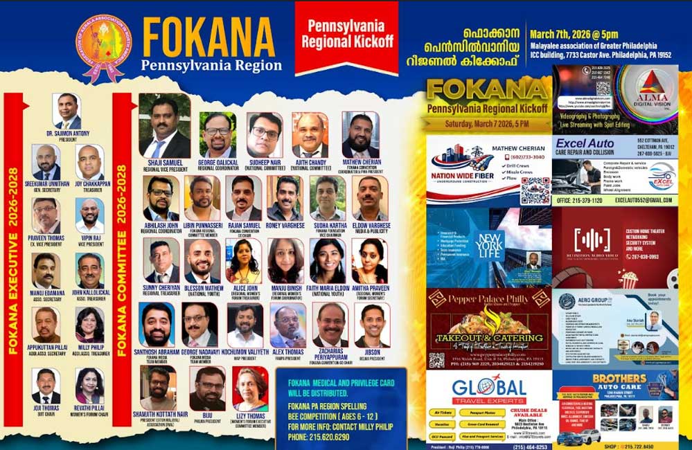 ഫൊക്കാന കണ്‍വന്‍ഷന്‍ പെന്‍സില്‍വേനിയ റീജിയണല്‍ കിക്കോഫ് മാര്‍ച്ച് 7-ന് ഫിലാഡല്‍ഫിയയില്‍